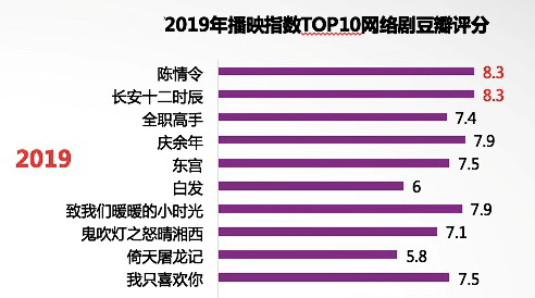 播出的多部IP剧中,男频IP剧表现优异,以网络热度TOP10榜单为例,《庆余年》《长安十二时辰》《全职高手》《黄金瞳》均在播出热度与口碑上,实现正向转化。尤其是年末播出的由腾讯影业牵头开发的《庆余年》,不仅频频登陆各大热搜榜单首位,其剧集主打的“古今思想交流”的核心价值观,也相较于过往男频IP剧,大幅度提升。