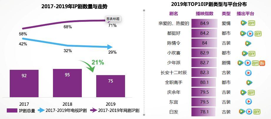 2019年剧集市场有一个显著特征是,剧集市场IP剧数量出现近三年来首次下降趋势,数量仅达到75部,同比18年下降了21%。从制作层面来看,今年IP剧市场,播出渠道多以网播渠道为主,尤其是受到古装剧政策影响,从而圈层化、垂直化效应,在今年显著。