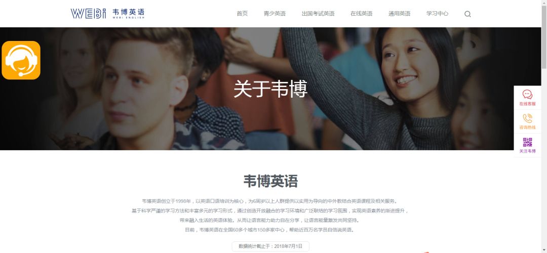 据韦博英语官网显示,韦博英语创立于1998年,以英语口语培训为核心,为6周岁以上人群提供以实用为导向的中外教结合英语课程及相关服务。截至目前,韦博英语已经在全国60多个城市有150多家中心。韦博英语产品外,韦博教育旗下还有韦博开心豆少儿英语、韦博嗨英语等。