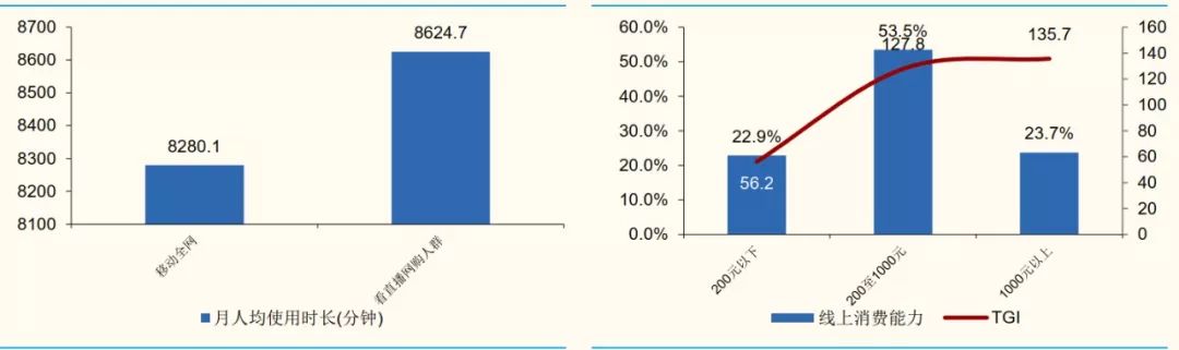 从年龄结构来看,抖音和快手25至35岁人群占比分别为47.7%和48.1%,我们推测观看抖音直播和快手直播的用户年龄结构与App用户属性相比,25至35岁人群的占比可能还会稍高一些,这类人群购买意愿充足且购买力较高,对于直播带货的贡献相对较大。