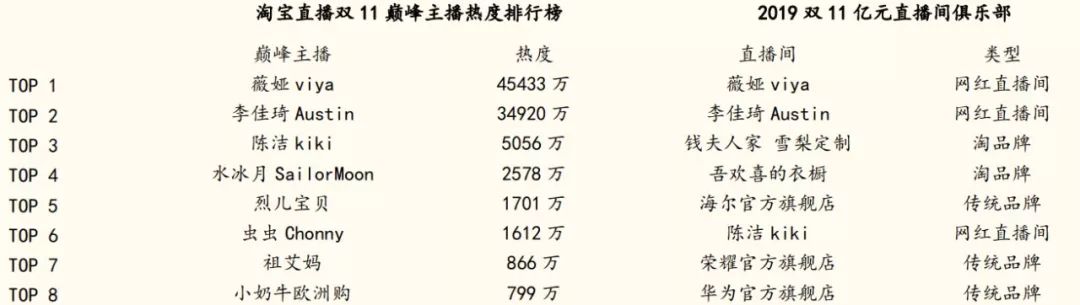 2019年双11淘宝直播引导成交近200亿,有17个直播间引导成交超过亿元,其中4个网红直播间(薇娅、李佳琦等)、3个淘品牌直播间(雪梨、张大奕等)、其余都是传统大品牌的天下(小米、海尔等)。