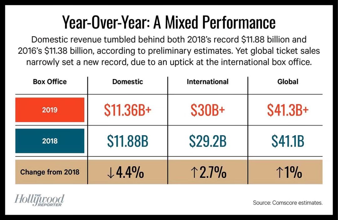 这是2019年全球电影市场交出的答卷。从同比2016、2017年保持着3%左右的增幅,到同比2018年只有1%的微涨,全球电影市场的微增态势稳上加稳。