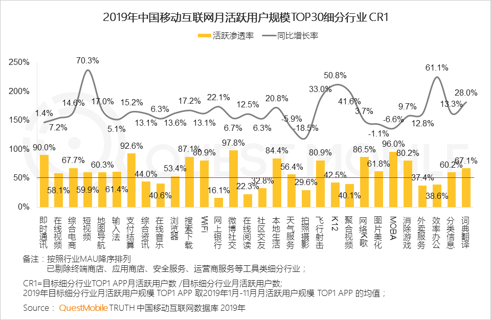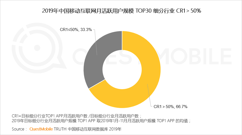 QuestMobile数据显示,截止到2019年底,2/3细分行业用户规模Top1 APP 覆盖超半数行业用户, 其中,即时通讯、支付结算、微博社交、MOBA等行业,Top1 APP用户,超过全行业90%,这种马太效应,让热门、成熟领域的后发玩家生存状况异常艰难,如何突围呢?