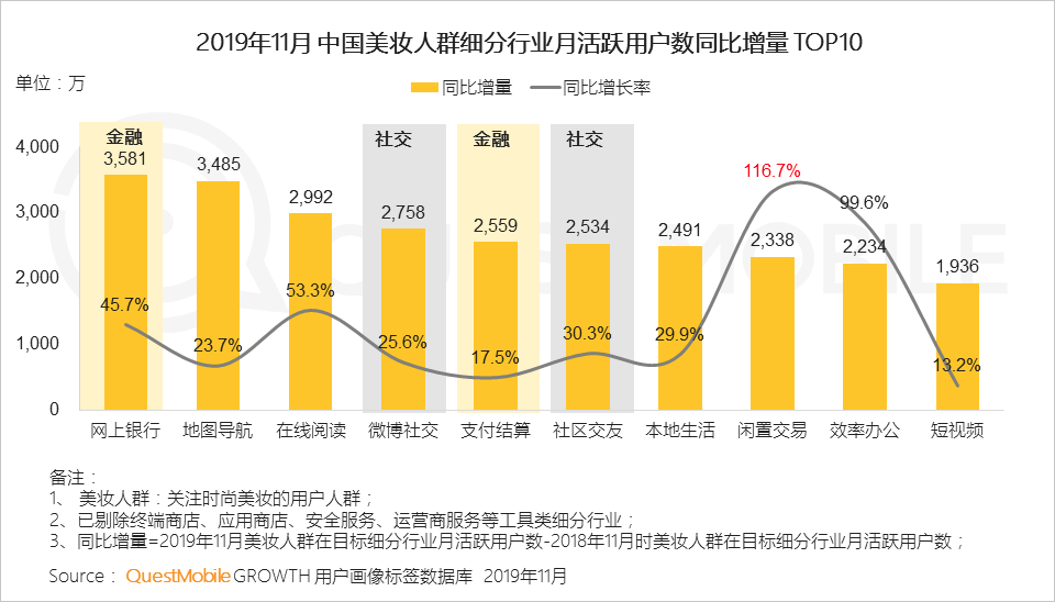 3、颜值经济崛起,美妆人群带动与消费相关的金融行业、可创造美妆/护肤相关内容的社交行业的增长