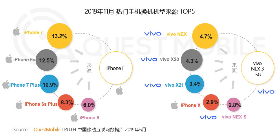 4、苹果手机用户忠诚度高,iPhone11 换机主要来源是苹果手机用户,vivo NEX3 5G用户主要来源于vivo