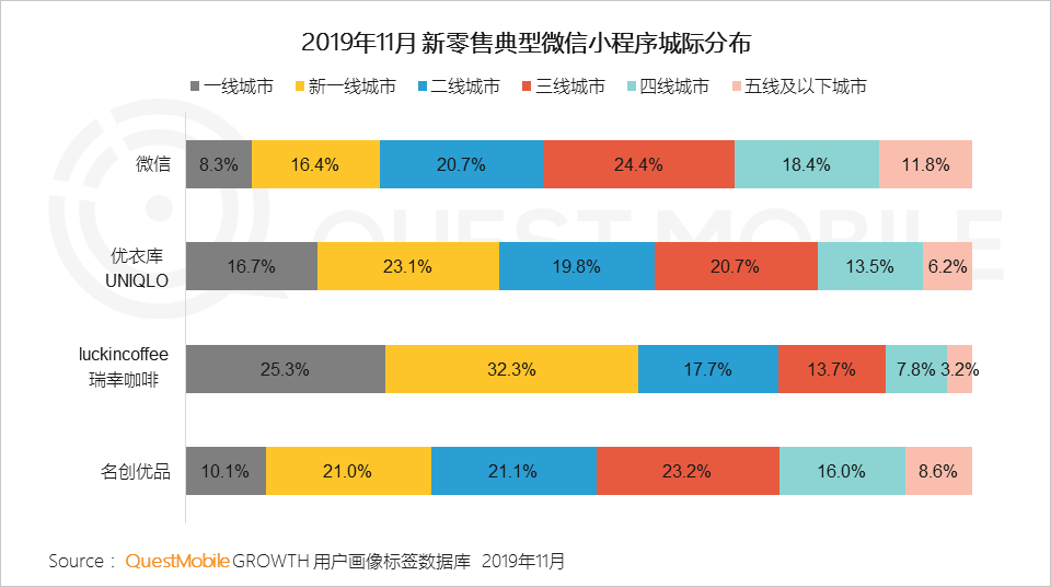 3、优衣库、瑞幸、名创优品微信小程序客群特征年轻化,高线化,其中19-24岁、新一线城市及以上占比显著高于微信;同时名创优品微信小程序客群以女性为主