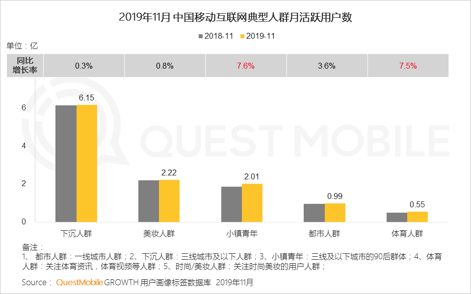 下沉人群规模庞大,达6.15亿;小镇青年、体育人群用户规模增速远超全体网民。