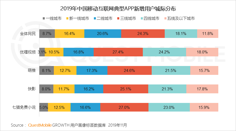 4、优喱视频、萌推、快影、七猫免费小说等泛娱乐APP的增长来源均是下沉用户