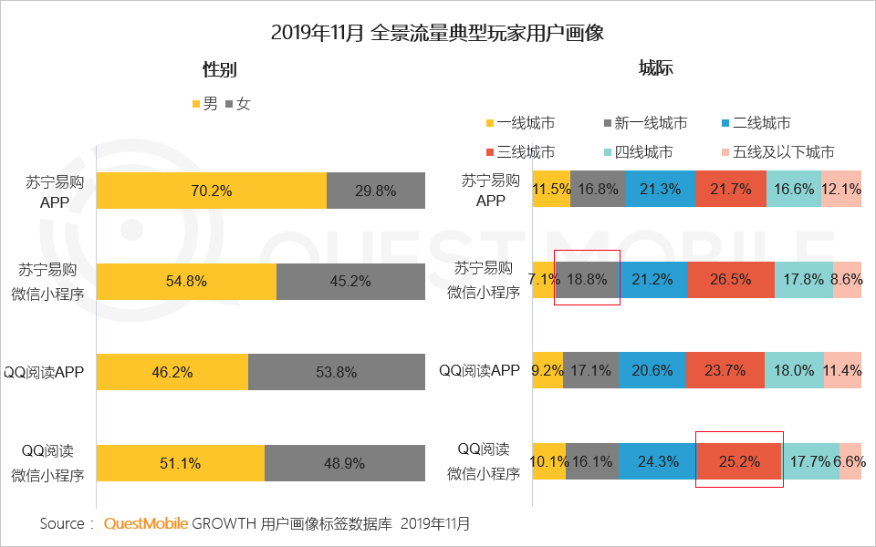 3、苏宁易购、QQ阅读凭借全景生态流量获取不同结构人群