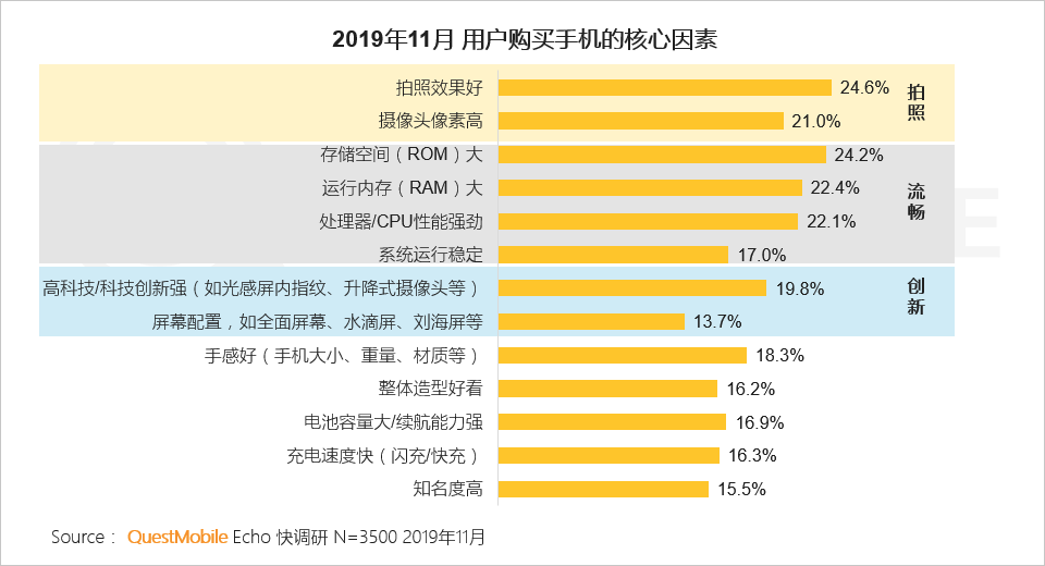 2、拍照效果、使用流畅度、技术创新是影响消费者购机的重要因素