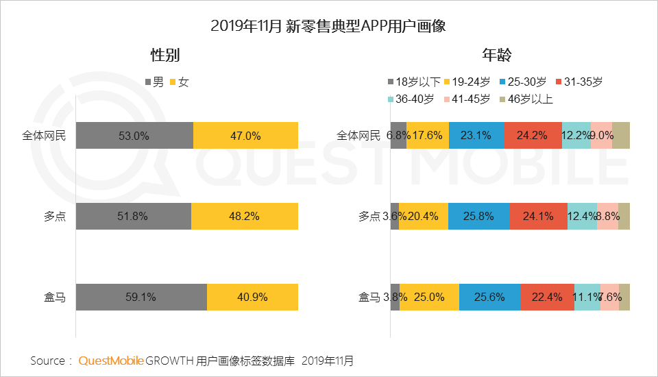 4、多点、盒马的一线城市、19-30岁的年轻人占比显著高于全体网民