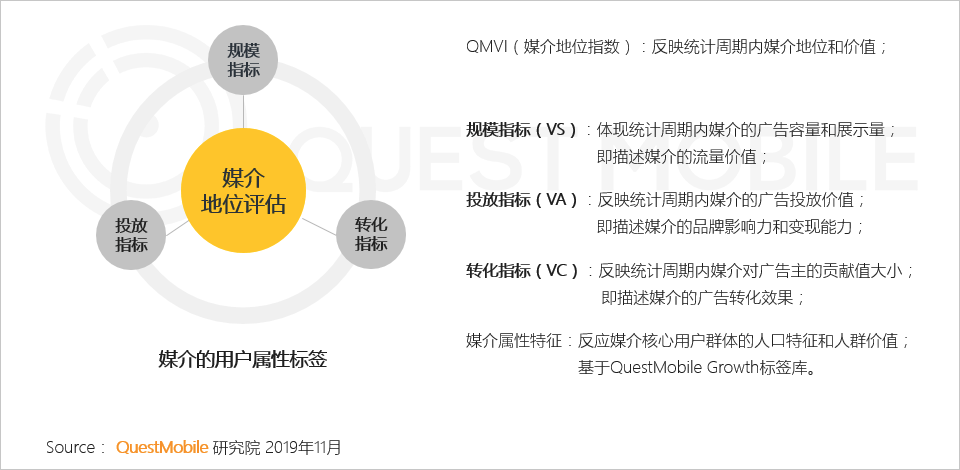 2、媒介地位指数(QMVI):反映媒介当期广告投放热度和投放价值度,由规模指标、投放指标、转化指标加权计算得出