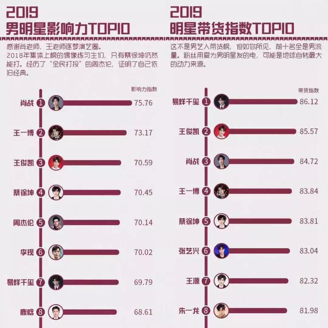 《2019腾讯娱乐白皮书·明星篇》显示,“三爆爆”在今年分别登上了男明星商业价值榜单、男明星影响力榜单、明星热度带货排名榜单、国民认知度等6大数据榜单(TOP10),其中肖战一人就分别占领男明星影响力榜单和腾讯新闻星推榜两大榜单首位,是当之无愧的新晋顶流。
