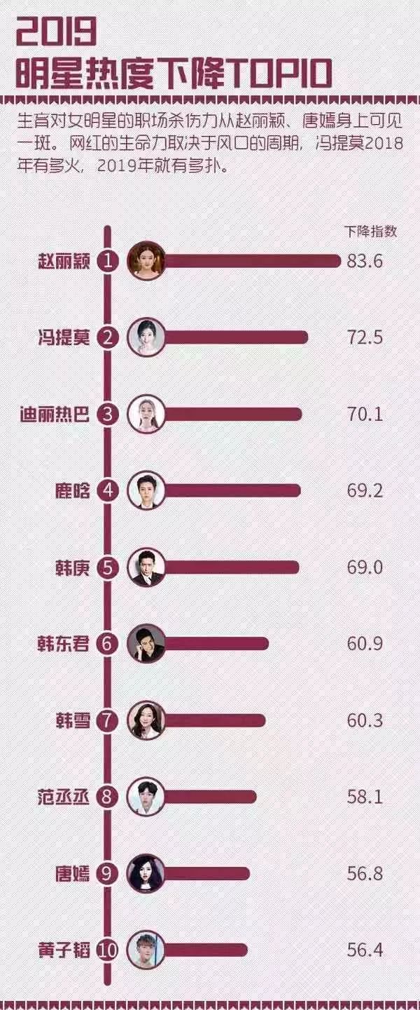 可即便如此勤奋,观众还是会“因为档期空缺”而不再对他们买账。赵丽颖因为婚后产子接近一年无新作品,已经出现在明星热度下降榜单首位;唐嫣的“少女感”也难以遮挡其热度的下滑。还处在娱乐圈焦点中心的杨幂,也不再是因为作品站稳脚跟,还是通过人设、综艺与婚恋新闻在努力维持自己的人气。