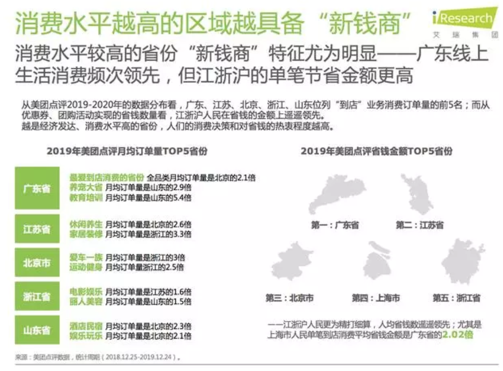 比如,经济越发达的地区「钱商」特征越明显,2019年,广东、江苏、北京、浙江、山东位列生活服务消费频次前5名;而从优惠券、团购活动实现的省钱数量看,江浙沪人民在省钱的金额上遥遥领先,尤其是上海人民单笔消费平均省钱金额是广东的2.02倍,而在年龄结构上,也呈现出银发族、家庭中坚力量、新晋父母、95后等老少通吃的结构。
