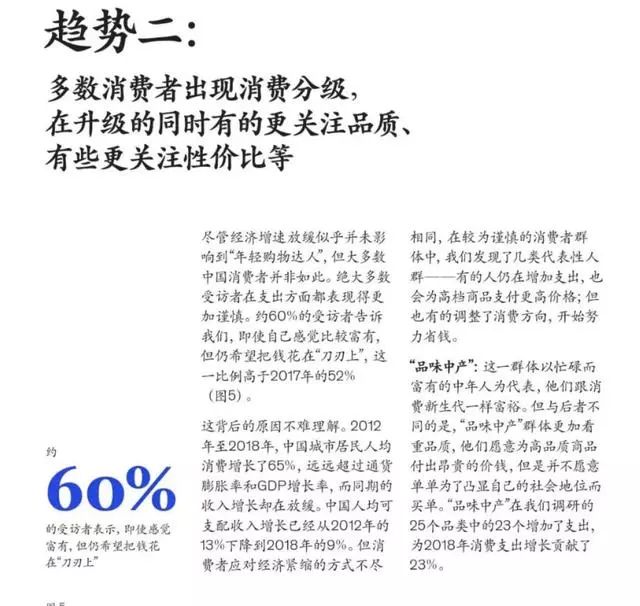 来自《麦肯锡:2020中国消费者调查报告》的数据显示,2012至2018年,中国城市居民人均消费增长了65%,远远超过通货膨胀率和GDP增长率。但其中有60%的受访者表示,即使感觉富有,但仍然希望把钱花在「刀刃上」。尤其是在具有代表性的人群中,有人仍在增加支出,也会为高档商品支付更高的价格,但也有的调整了消费方向,开始努力省钱。