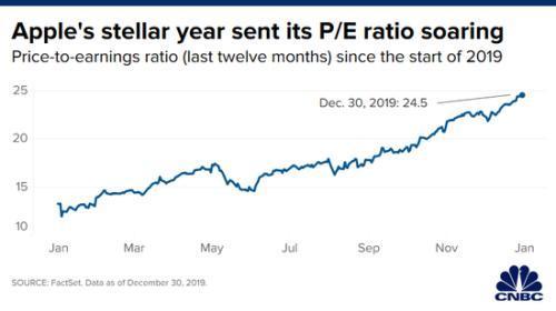 据FactSet数据显示,苹果2019年年初的市盈率略高于13,低于其五年平均值约16,目前已达到24.5。此外,该公司的远期市盈率略低于22点,也达到历史最高水平。