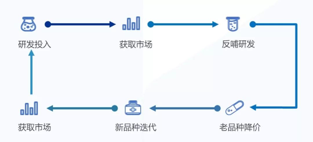 在这样的认知下,我们看到医药企业的成长模型其实未变——研发投入、做出产品、获取市场、反哺研发、然后老品种降价,新品种迭代的不断循环。
