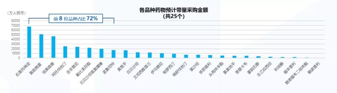 从品种来看,25个品种里面前8位的品种在带量的金额上占比已经超过70%;从企业来看,37家企业里面的前10位带量采购金额占比已经超过73%。