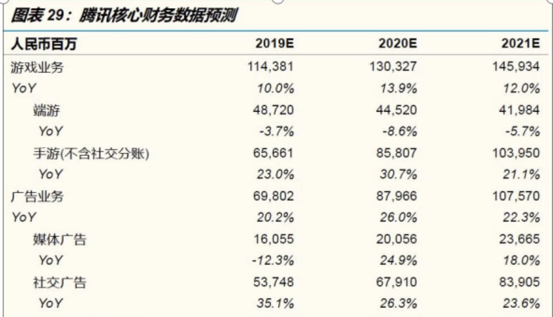 按照国金证券的预测,2019年、2020年、2021年,腾讯的广告业务收入分别可以达到698亿、880亿、1080亿,年均增长幅度都在20%以上。
