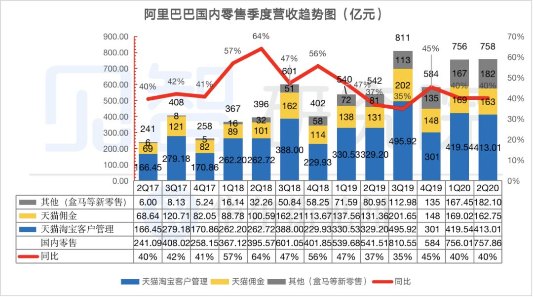 财报显示,2019财年Q4(对应自然月2019.1.1-3.31)—2020Q2,阿里巴巴每个财季的广告收入(即客户管理收入)分别为301亿元、419.54亿元、413.01亿元,同比增速分别为31%、27%、25%。