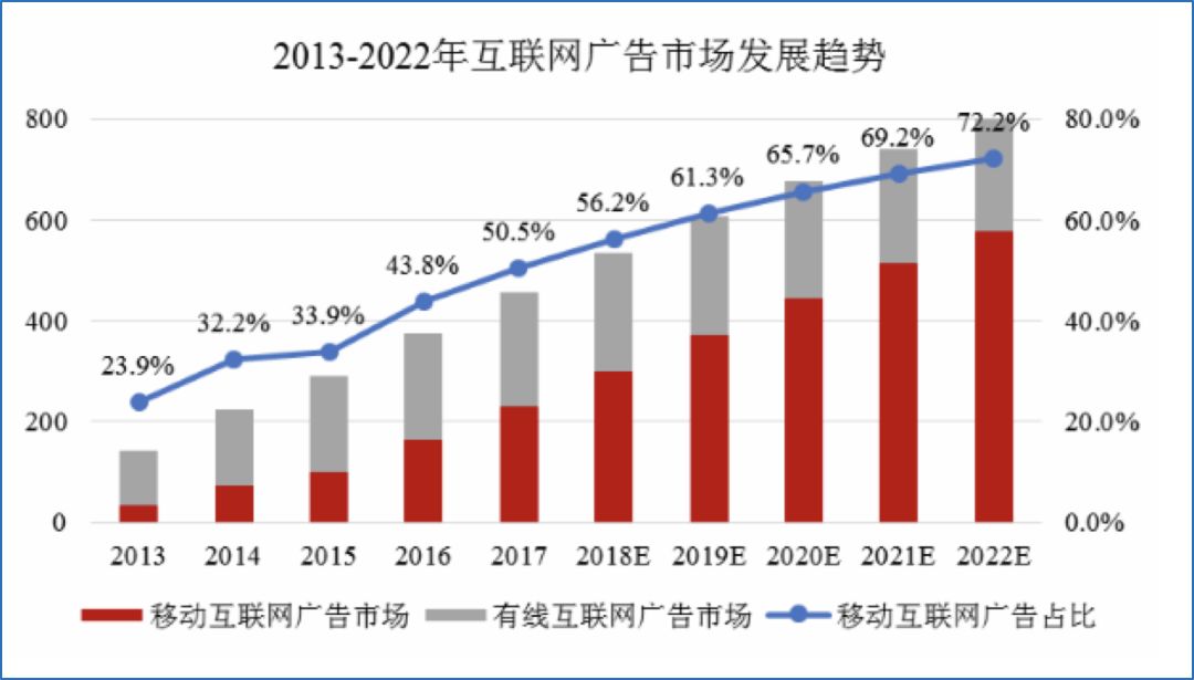普华永道认为,中国互联网广告市场收入将从2017年的457亿美元,增长到2019年的600亿美元,未来依旧将以11.8%的年均复合增长率持续增长,2022年将达到800亿美元。