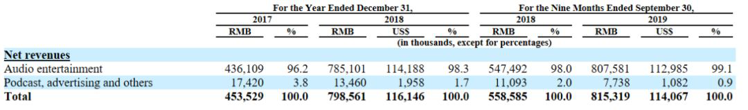 招股书显示,音频娱乐产品(虚拟礼品)的营收由2017年的96.2%提升至2018年的98.2%,2019年前三季度,占比更是进一步提升至99.1%。播客、广告等收入占比则持续萎缩,由此前2017年的3.8%,到2018年的1.7%,再到2019年前三季度低至0.9%。与虚拟礼品产生的收入相比,广告业务几乎可以忽略不计了,这与荔枝所选择的UGC战略方向有关。