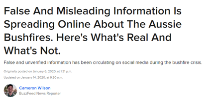 譬如此前,Facebook上有帖子呼吁新南威尔士州当地居民把红色或橙色丝带绑在自家大门或邮箱上,以表示对消防员的感谢。之后,有帖子称,现场急救员要求居民不要这么做,因为火警救援需要这些彩带来进行标记。但根据法新社对新南威尔士州消防救援局的采访,消防员在救火时并未使用丝带,而是通过消火栓来进行标记。