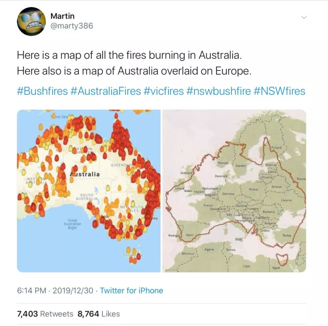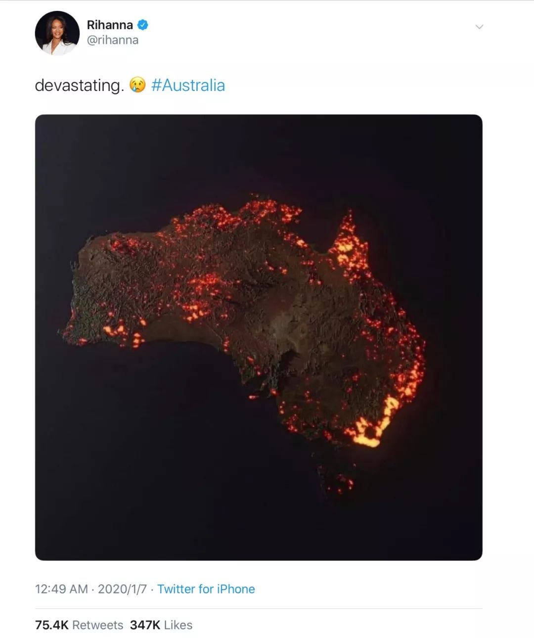 这张「被火烧焦的澳大利亚」,想必国内的社交媒体用户并不陌生。当Twitter上的用户第一次看到这张所谓的“澳大利亚卫星实景图”的时候,内心恐怕和图中的土地一样焦灼。连著名歌星蕾哈娜也在1月6日发布了这张图,表达了自己的心疼,推文一周后获赞34万次,转发次数也超过7万。