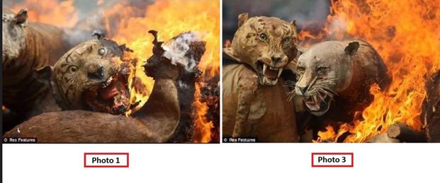 如这两张火海中的老虎照片,拍摄于2012年11月的雅加达。当地政府收缴了大量的填充动物玩具,这些濒危野生动物被偷猎者杀害,后被制成真皮动物玩具,作为装饰品贩卖。