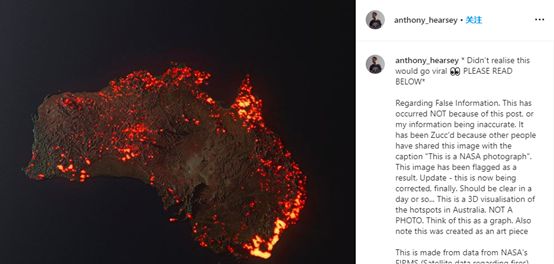 依然以这张在Instagram上广为流传的卫星照为例,Anthony Hearsey表示,该照片是根据NASA在12月5日——1月5日的卫星数据而制作出来的3D图片,并强调自己在制作时,加上了橙色光芒,所以图片有夸大的成分。