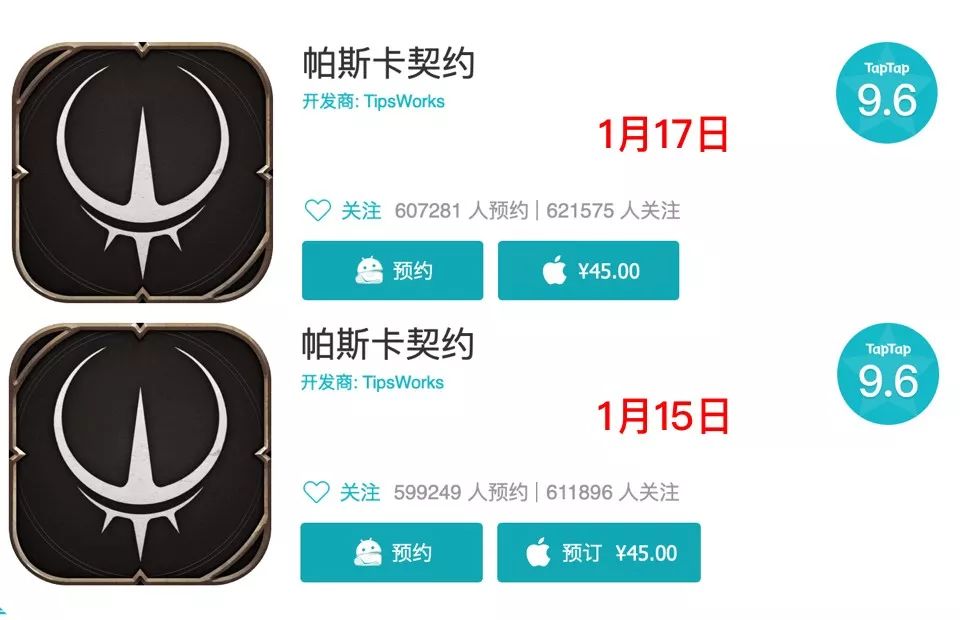 TapTap数据显示,1月15日《帕斯卡契约》预约数599249,评分9.6。1月17日该作上线一天后,预约数破60万,评分9.6。难得一款游戏在上线前后,皆保持良好口碑。