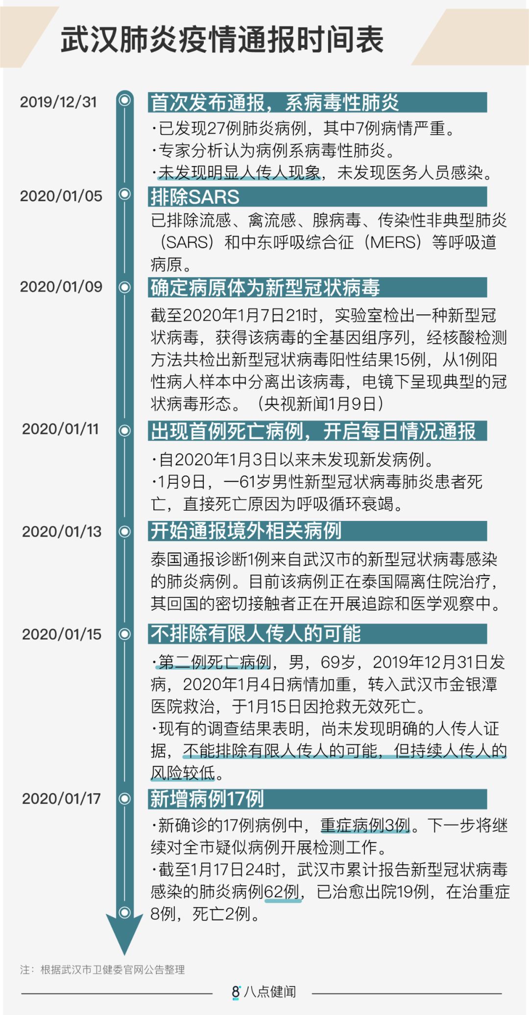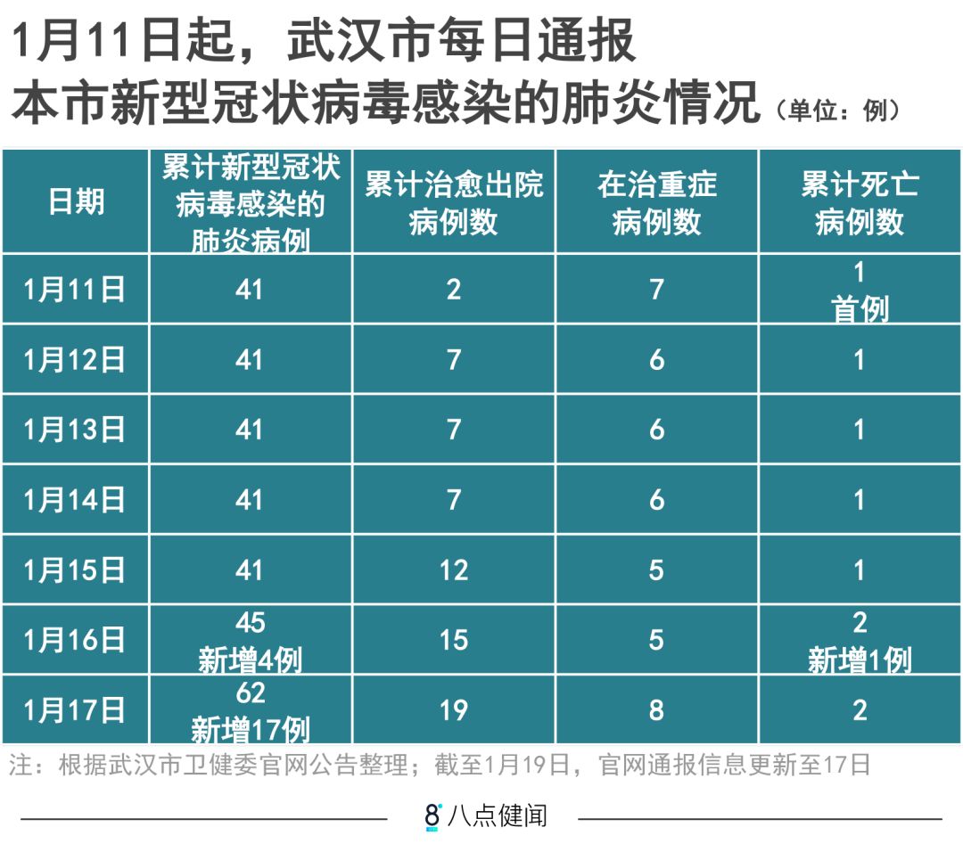 截至1月17日24时,武汉累计报告2019-nCoV肺炎病例62例,已治愈出院19例,在治重症8例,死亡2例。