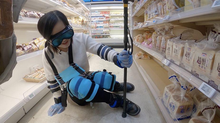 穿上这套装备后,能够明显感觉到指关节的灵活性变低,听不清高音频的声音,视线模糊,视野狭小。负重拖鞋、曲背用围兜、负重脚腕带,让人行动缓慢且费力。