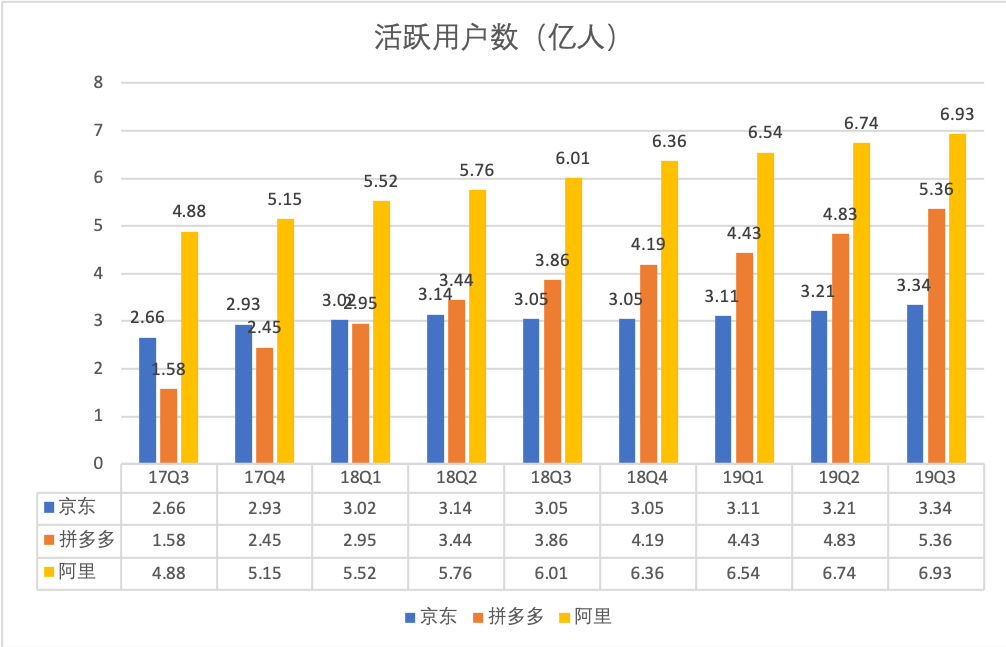 2019年11月,拼多多发布三季度财报,数据显示年活跃用户数量达到 5.36亿,与淘宝的用户体量相差不到1.7亿,并再次拉大同京东用户体量的差距。
