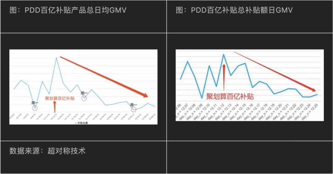 《超对称技术》在监测了大量数据后发现:拼多多只对总商品数的0.5%进行“百亿补贴”,却贡献了10%左右的总GMV。另一方面,拼多多“百亿补贴”效果也受到了聚划算的冲击,在聚划算双十二当天加入“百亿补贴”后,拼多多平均销量相比上半月(不含双十二当天)下滑了32.9%,而GMV则下滑了34.4%。