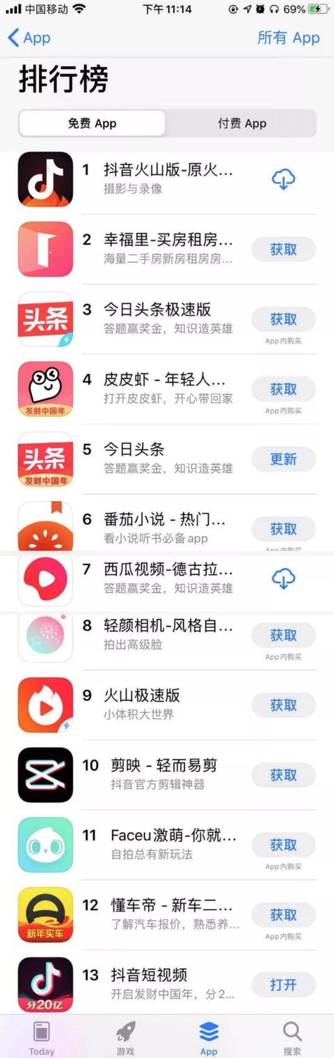 截至2020年1月19日,在苹果应用商店免费应用排行榜中,前13位均为头条系应用,类似的场景在2019年初也曾出现。