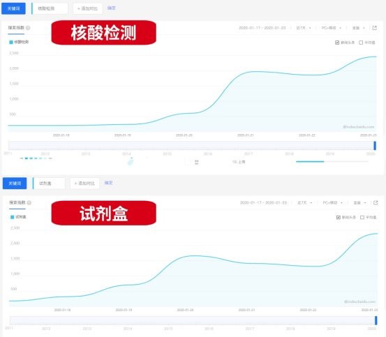 封城后,武汉用户搜索最多的不是“天价蔬菜”(该词百度指数热度反而不如北京上海),更关注的是“84消毒液”“体温计怎么用”“n95口罩”等自我防护关键词。同时“试剂盒”、“核酸检测”是当地用户关注的重点,这些关键词与病情确诊有关,这验证了武汉医疗资源特别是试剂盒紧张的现状。