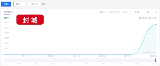 《大数据告诉你,疫情风暴中心的武汉人到底关心什么?》一文主要关注疫区中心的武汉人民的关切。1月23日,百度指数显示武汉地区“封城”、“武汉封城”的搜索指数迅速上升,在搜索地域分布中,武汉都是排第一的城市。