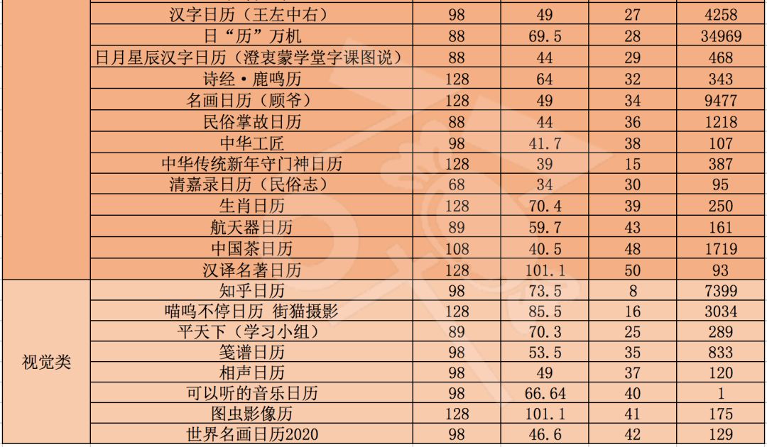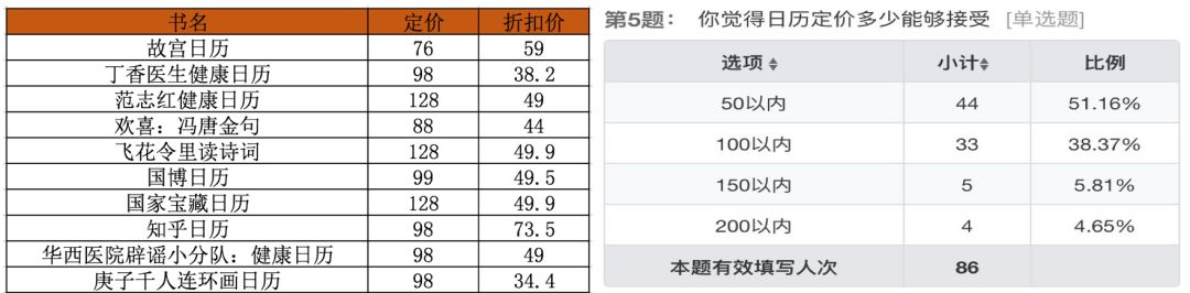 据硬糖君观察,当当网销量前50的日历平均定价为100元/本(折后平均售价53元/本),销量前10 的日历平均定价为103.9元/本(折扣平均售价49.64元/本)。结合“日历使用情况”的问卷调查,推测日历书最佳售价区间应为:50-100元。