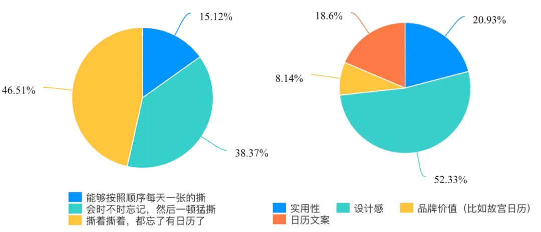 如此繁荣的日历市场,消费者究竟是怎样的构成与想法。硬糖君进行了“日历使用情况”问卷调查,在86个有效样本中,仅15.12%的人能做到“按照顺序每天一张的撕”,多数人都是阶段补撕,或者压根忘了自己有这玩意儿。