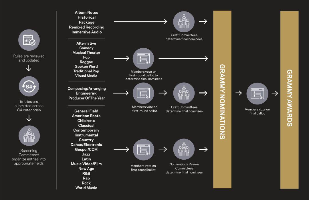 格莱美在近几年的投票规则也有所调整,2019年第61届格莱美规则中世界音乐类奖项直接由评审委员会审核提名,而其他奖项普通投票者在第一轮投票中投出前15名,之后15个候选者由专门的委员会进行不记名投票并确定出最终的五个提名。
