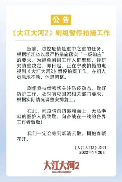 几大头部剧集率先发声,引领全行业的“停工浪潮”。1月26日,正在浙江宁波拍摄的正午阳光新剧《大江大河2》宣布剧组停工,杨幂和白宇主演的医疗剧《谢谢你医生》也宣布暂停拍摄。