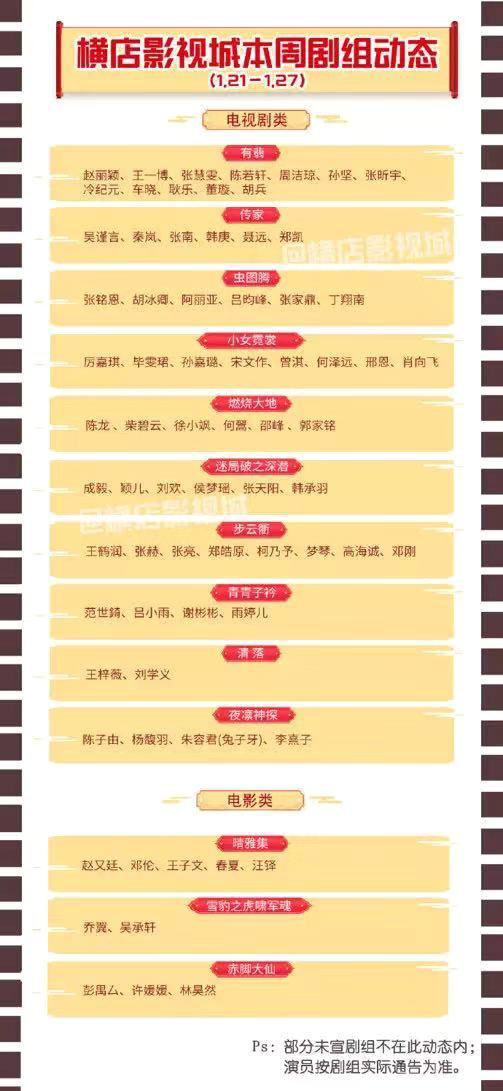 1月27日,横店影视城发布通知,“根据东阳市疫情防控工作指挥部令关于‘取消聚集性活动’要求,剧组拍摄属于人员密集活动,容易引起交叉感染,为切断病毒传播途径,确保剧组人员生命安全”,要求正在拍摄中的剧组拍摄活动全部暂停。