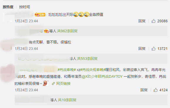 2020年,几度冲击春晚的谢娜终于成功登上了春晚舞台,和肖战、鞠婧祎一同表演了小品《喜欢你喜欢我》。微热点数据显示,《喜欢你喜欢我》以43.33的热度指数成为鼠年春晚网友最关注的节目。但“微博综艺”发出的、播放量超过1700万的小品视频下,热评第一、第二都表示节目“尬出天际”“有点无聊”,甚至压过了肖战的粉丝控评。