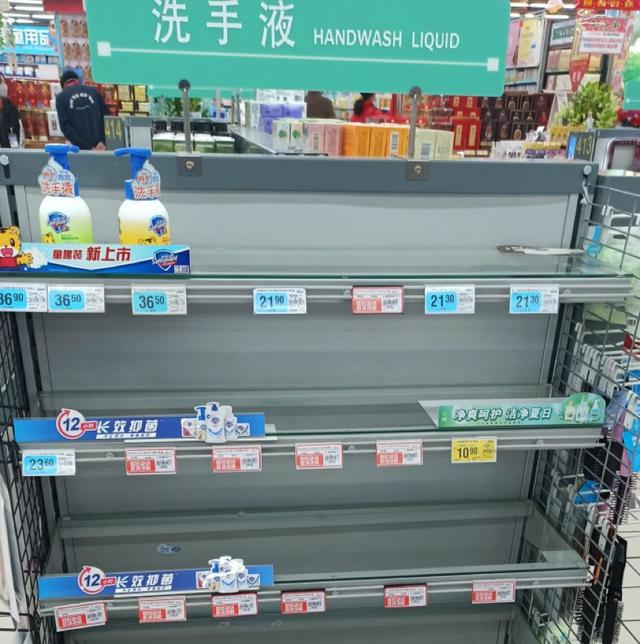 我本来想去囤点洗手液、消毒液、口罩之类的物品,但没想到全部被抢购一空,如果不是眼疾手快,恐怕连消毒湿巾、肥皂都被抢空了。在食品区,两面放泡面的货架都空了,速食速冻食品、零食也都空了一大半。
