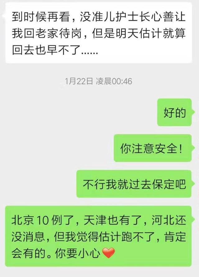 除夕那天,我看到新闻上报道说保定确诊了首例肺炎病例,但病例并非是她所在的医院,那天的春节联欢晚会,我们看的提心吊胆,不知什么时候来一个通知,让她回医院上班。