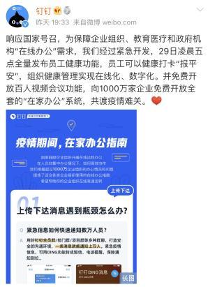1月29日,阿里钉钉向1000万企业免费开放在家办公系统,助力全社会疫情特殊时期的正常运转,主功能包括远程视频会议、方便教育机构和学校使用的群直播、保障企业组织疫情期间消息精准触达的DING功能、保障组织分散办公效率的日程共享、任务协同、在线文档协同、远程打卡功能。