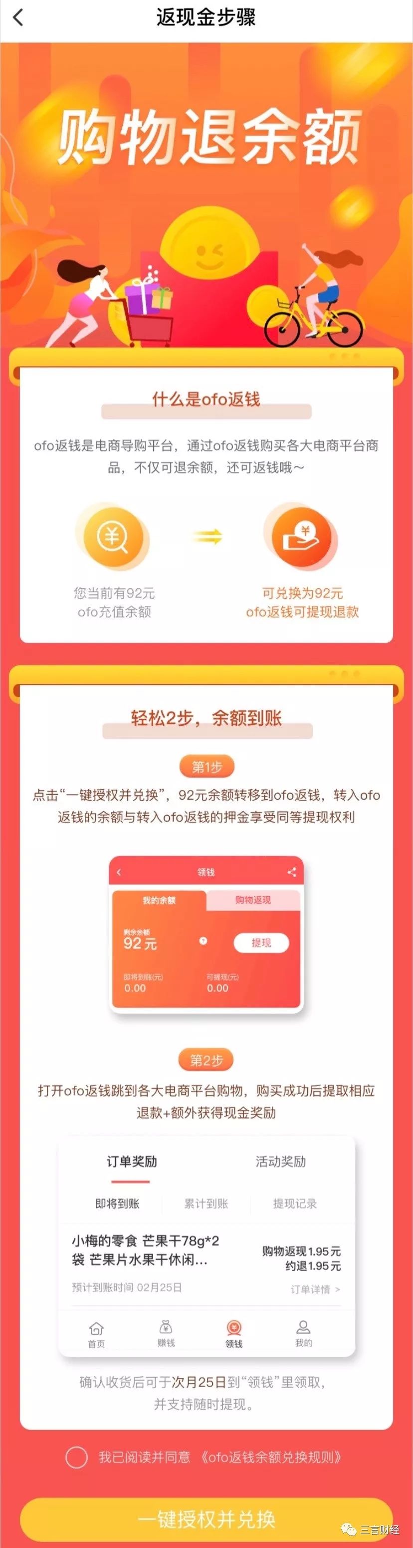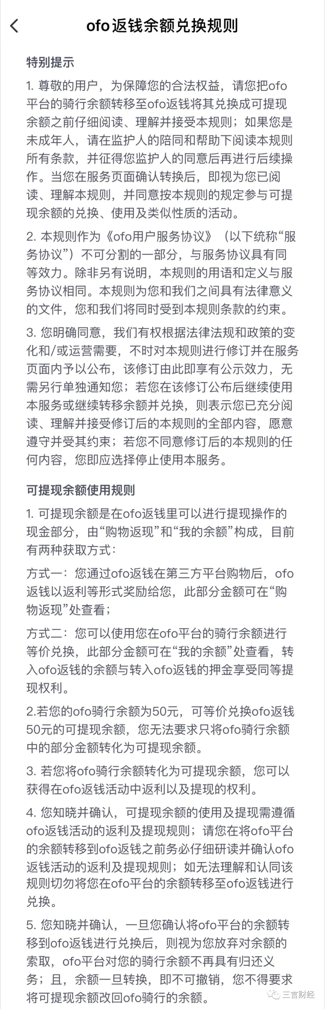 App中有关提现说明指出,当用户总可提现金额达到20元时,即可提现20元;同时App提示称,“可提现”板块金额不能大于“ofo返钱”金额。比如,目前三言财经“ofo返钱”余额中有30元,那么通过购物获得的返利和退余额总数封顶为30元。