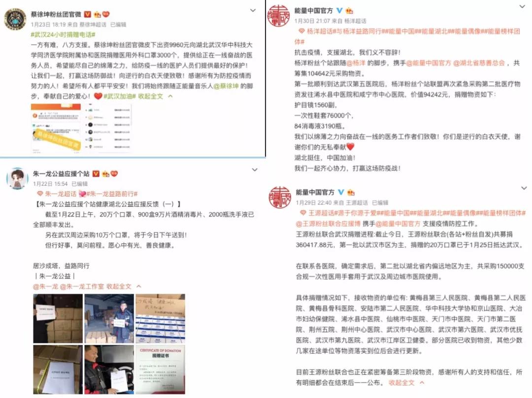 最后,是实打实的疫区捐款,朱一龙、易烊千玺、杨幂、蔡徐坤等粉丝后援会都相当“给力”的进行筹备物资。据统计目前已有几百家艺人粉丝参与到这场抗疫捐赠行为中,诸多粉丝后援会在具体方面,如捐献物资、数额、定向医院等信息公布也比较透明,做法也获得网友的认可。